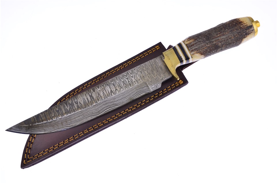 Red Deer has really knocked it out of the park with this 13 1/2" Stag Bowie! With Damascus Blade and Leather Sheath, stock is limited, so add to your cart before they are all gone.