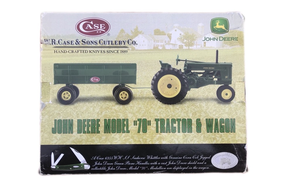 This unopened gift set includes one John Deere Ertl Tractor Model 70 and one Case 6355 Seahorse Whittler with Corn Cob Jigged John Deere Green Bone Handle.