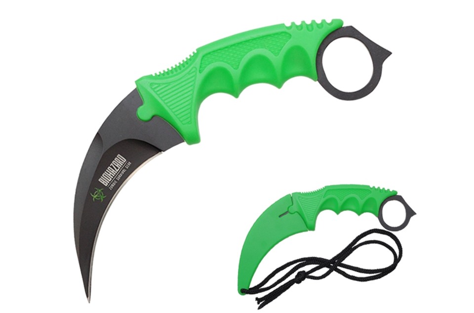 Biohazard fans are going to love this 7 1/2" Green Composite Karambit! With Composite Sheath, Black Matte Stainless Steel, and Lanyard, no one can resist, so get yours while you can!