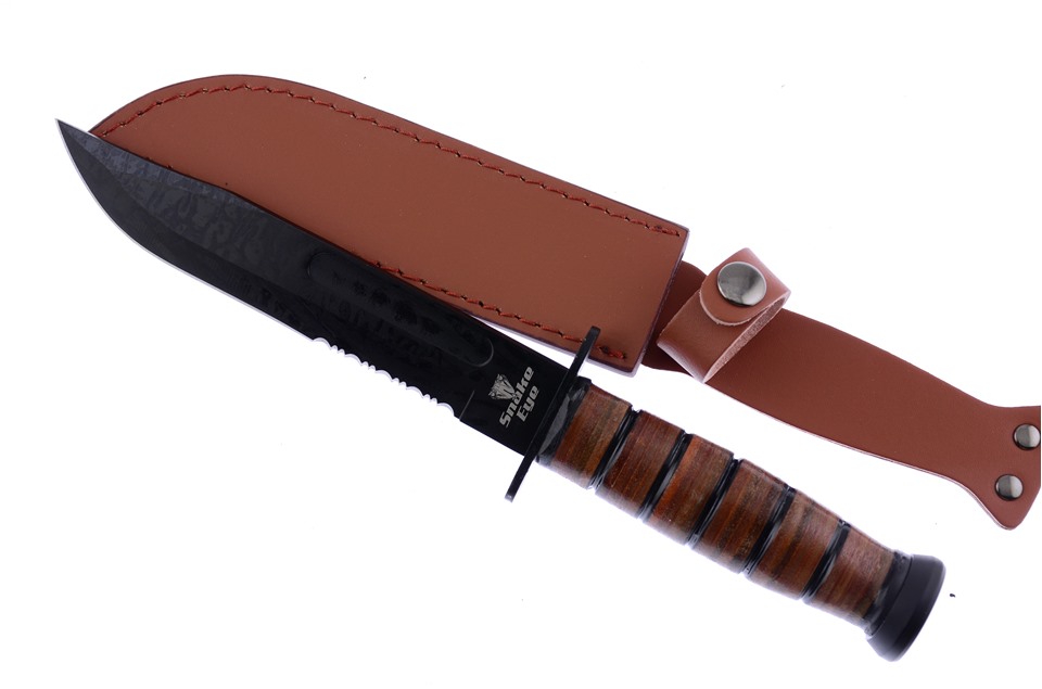 This 12 1/2" Stacked Leather None is another great piece from Snake Eyes. It has Half-Serrated Blade and Black Matte Stainless Steel and, this item is going to sell like hotcakes, so get yours now.