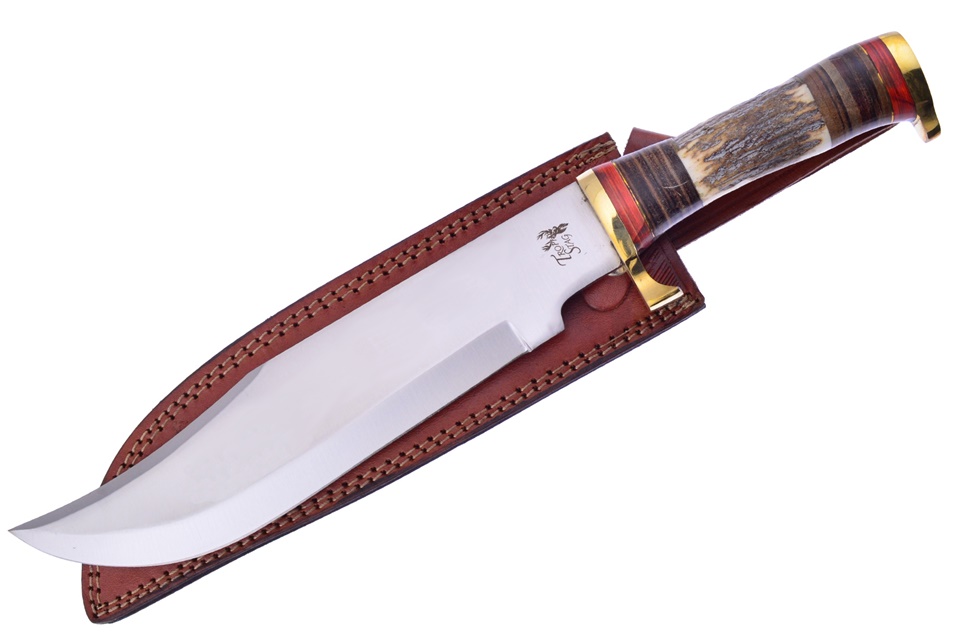 The 16 1/2" Stag/Stacked Leather Combination Bowie by Trophy Stag is a long-time best-seller! , this is going to be flying off the shelves, so don't miss your chance to get one!