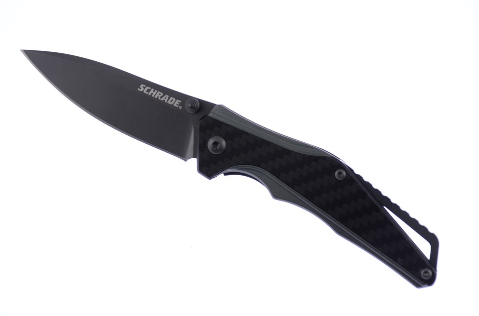 This 3 3/4" Black Carbon Fiber Tactical Folder is another great piece from Schrade. With details like Thumb Stud, Liner Lock, and Belt Clip, this is going to be flying off the shelves, so don't miss your chance to get one!