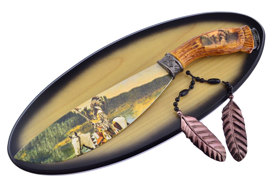 Frost Cutlery brings you this 12 1/2" Imitation Stag Composite Display Knife. It has Printed Blade and Decorative Plaque and this item is going to sell like hotcakes, so get yours now.