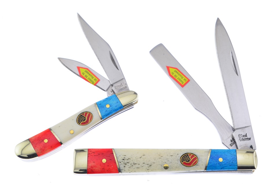 Here's a value you really don't want to miss. You'll get one of the 2 7/8" Red/White/Blue Smooth Bone Little Peanuts and one of the 3 3/4" Red/White/Blue Smooth Bone Doctor's Knives, featuring Stainless Steel Blade. You won't find a lower price anywhere!
