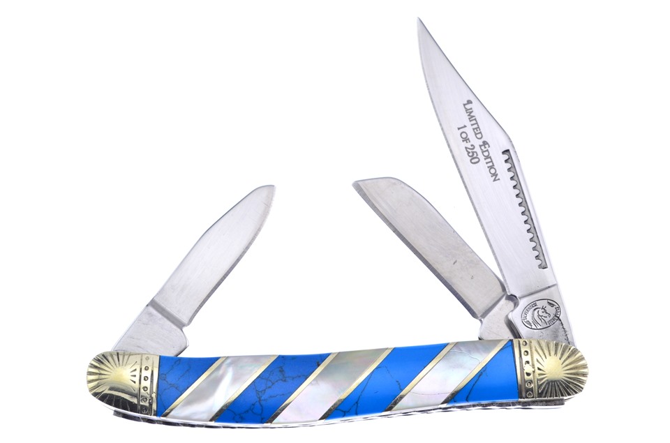 Silverhorse Stoneworks has really knocked it out of the park with this 4" Mother of Pearl / Turquoise Combination Wrangler! With details like Decorative Bolsters, Decorative Handle, and Stainless Steel Blade, you need to pop this in your cart now while supplies last!