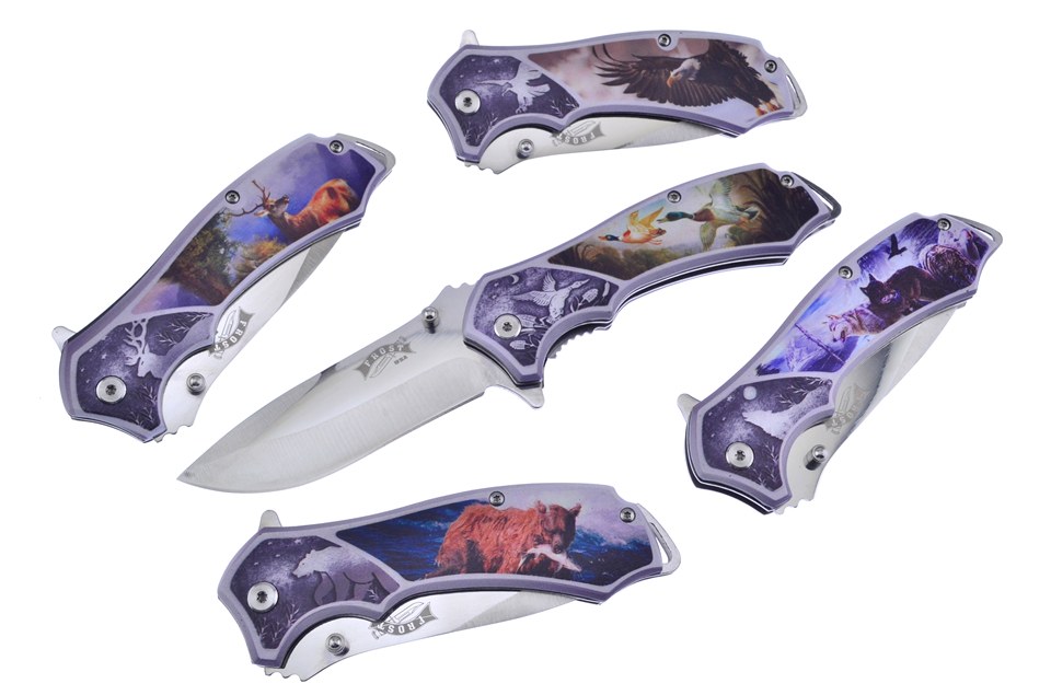 Just the thing for knife collectors everywhere. You'll receive one of the 4 1/2" Bear Print Stainless Steel Snapshot Tacticals, one of the 4 1/2" Deer Print Stainless Steel Snapshot Tacticals, one of the 4 1/2" Duck Print Stainless Steel Snapshot Tacticals, one of the 4 1/2" Eagle Print Stainless Steel Snapshot Tacticals with Handle Insert, and one of the 4 1/2" Wolf Print Stainless Steel Snapshot Tacticals. You won't find a lower price anywhere!