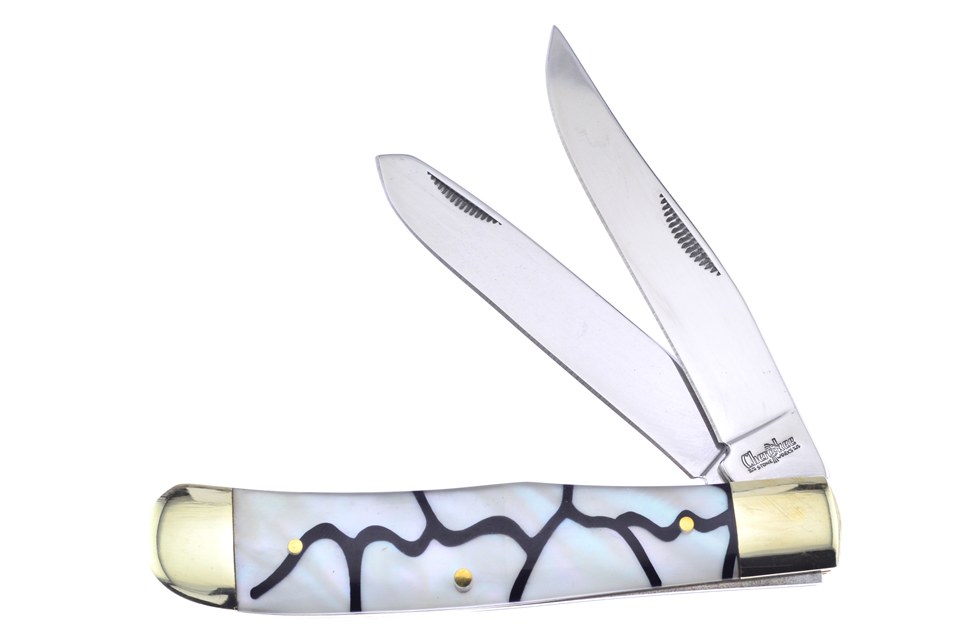 Introducing the 4 1/4" Jigsaw Mother of Pearl Trapper by Cherokee Stoneworks. With details like Brass Pins, 440 Stainless Steel Blade, and Thumbnail Pull, stock is limited, so add to your cart before they are all gone.