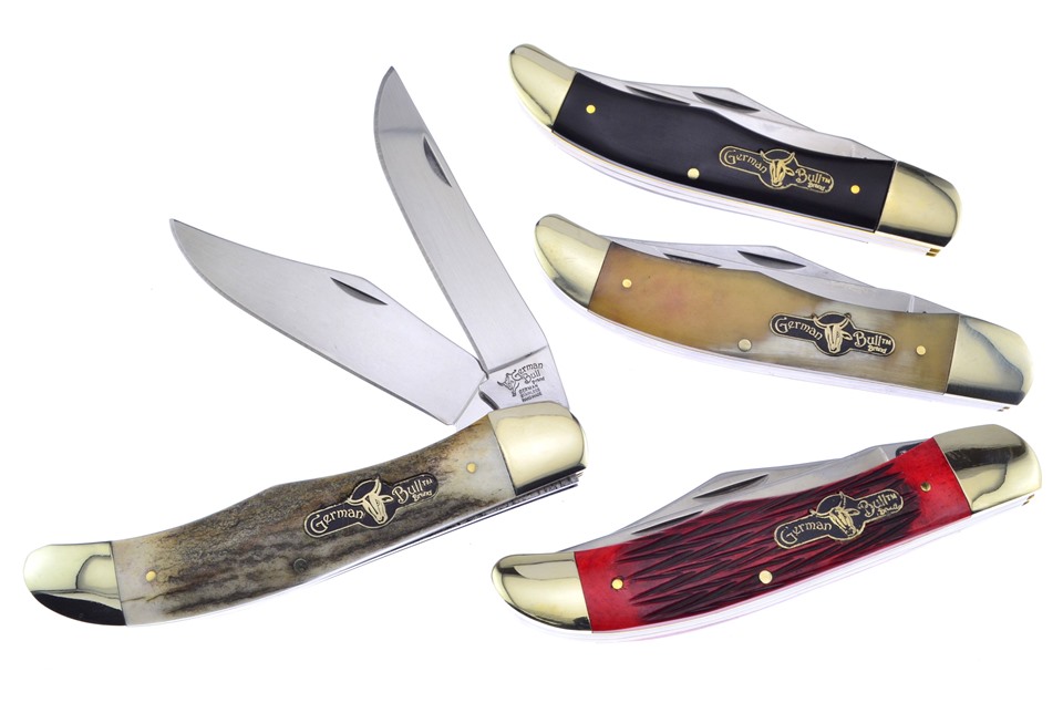 This set by German Bull is a great addition to your collection! You'll get one of the 5 1/4" Buffalo Horn Folding Hunters, one of the 5 1/4" Deer Stag Folding Hunters, one of the 5 1/4" Ox Horn Folding Hunters, and one of the 5 1/4" Red Picked Bone Folding Hunters, featuring Nylon Sheath. You won't find a lower price anywhere!