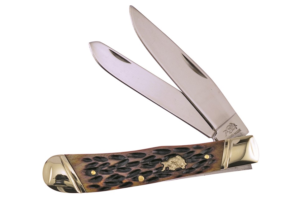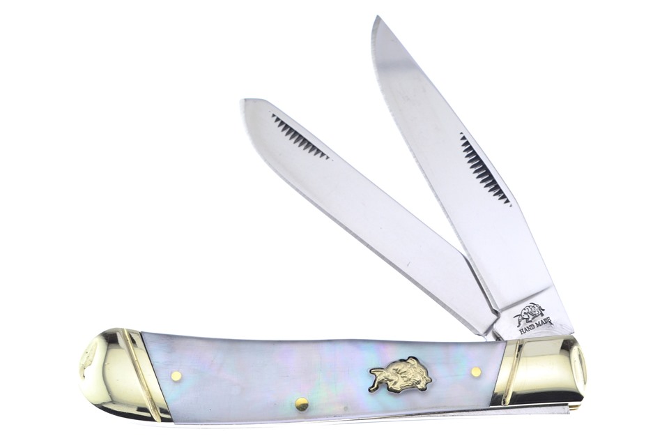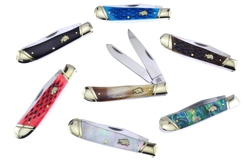 This set is a great addition to any collection. You'll get one of the 4 1/4" Abalone Trappers, one of the 4 1/4" Antique Green Bone Trappers, one of the 4 1/4" Buffalo Horn Trappers with Brass Liners, one of the 4 1/4" Dark Blue Jigged Bone Trappers with 1 of 300, one of the 4 1/4" Dark Red Jigged Bone Trappers with Brass Liners, one of the 4 1/4" Mother of Pearl Trappers, featuring Thumbnail Pull, and so much more! Sets like these go fast, so get yours while you can!