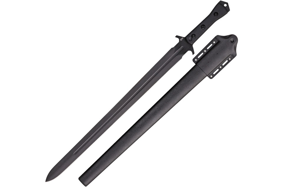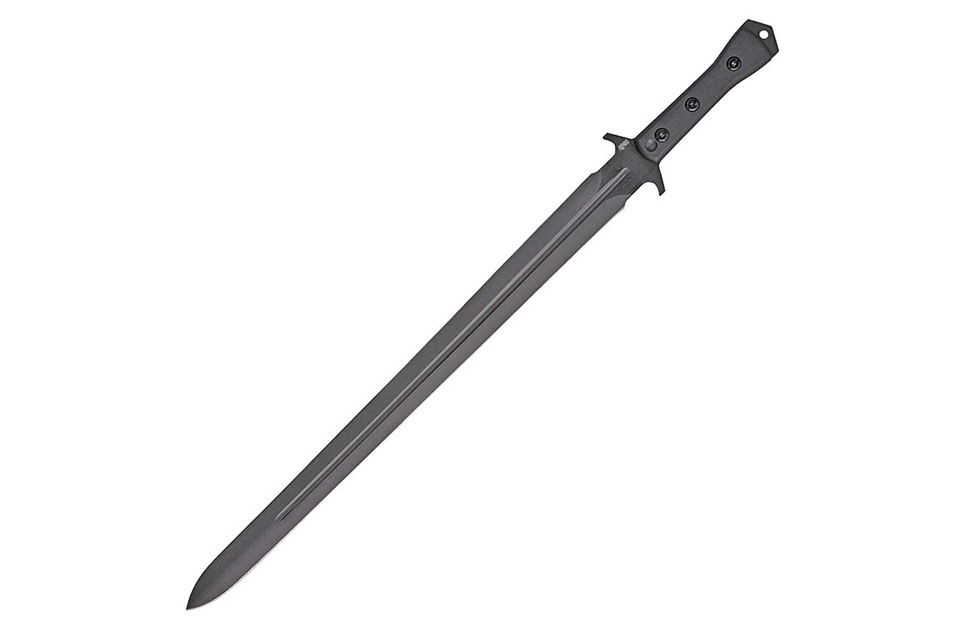 Designed by Angus Trim, the A.P.O.C. Tactical Broad Sword matches the close-quarters cut-and-thrust fighting abilities of the classic short sword with all the benefits of modern materials and practical design and craftsmanship. Well-suited to close combat, this sword brings far more reach and power to bear than a knife, yet is short enough to be used in tighter spaces or a short range scrum. The blade will cut, chop and hack a target with great ability and the ridgid blade is also a quite capable piercing weapon as well.