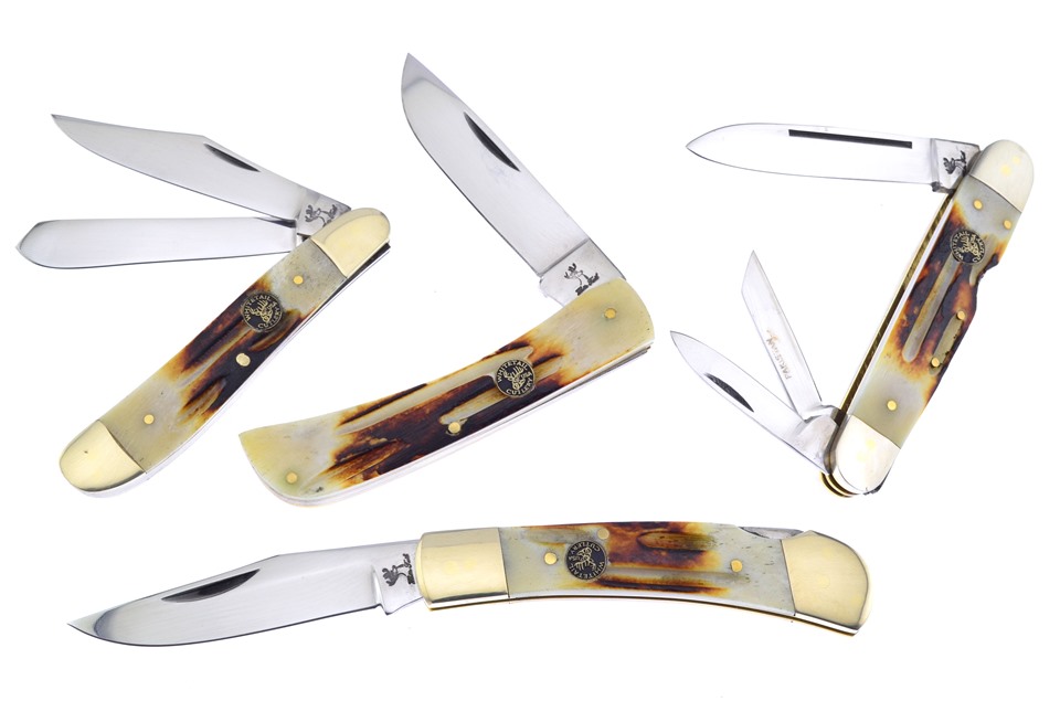 Here's a set of knives no collector will want to miss. Included in this set is one of the 3 3/4" Second Cut Bone Dirt Busters, one of the 3 3/4" Second Cut Bone Whittlers, one of the 3 3/4" Second Cut Bone Lockbacks, featuring Nickel Silver Bolsters, and one of the 3 1/2" Second Cut Bone Dogleg Trappers with Brass Pins. Sets like these go fast, so get yours while you can!