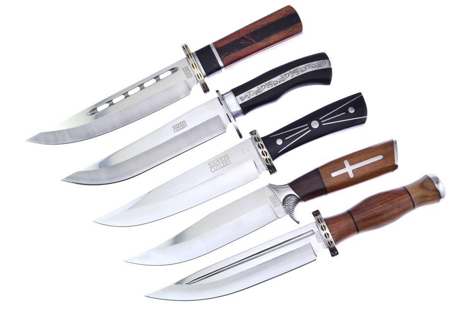 Here's a value you really don't want to miss. You'll receive one of the 12" Black Wood Bowies, one of the 12" Wood Bowies with Nylon Sheath, one of the 11" Wood Bowies, featuring Handle Inlay, one of the 12" Wood Bowies, featuring Decorative Guard, and one of the 12" Wood Bowies, featuring Wood Spacers. Sets like these go fast, so get yours while you can!