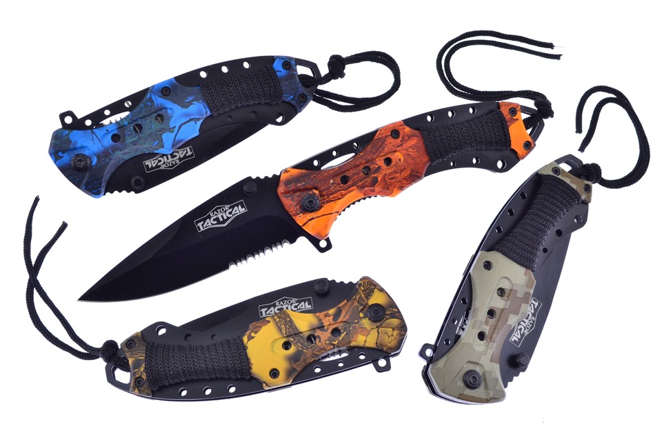 Here is a set of Razor Tac knives you don't want to miss! You'll receive one of the 4 1/2" Blue Camo Composite Snapshot Tacticals, one of the 4 1/2" Digital Camo Composite Snapshot Tacticals, featuring Assisted Opening, one of the 4 1/2" Orange Camo Composite Snapshot Tacticals, featuring Assisted Opening, and one of the 4 1/2" Yellow Camo Composite Snapshot Tacticals, featuring Liner Lock. Not all of these components will stay in stock, so throw this in your shopping cart now!