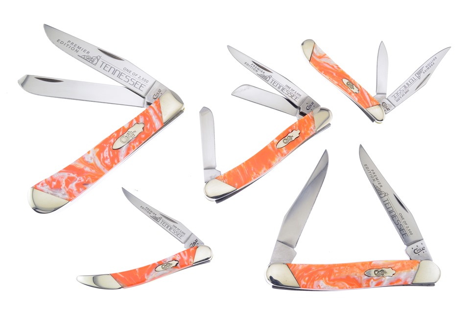 This set is a great addition to any collection. You'll get one of the 3" TN Orange Corelon® Small Toothpicks with Etched Blade, one of the 3 7/8" TN Orange Corelon® Muskrats, featuring Nickel Silver Bolsters, one of the 2 7/8" TN Orange Corelon® Peanuts, one of the 4 1/8" TN Orange Corelon® Trappers with Stainless Steel Blade, and so much more! Not all of these components will stay in stock, so throw this in your shopping cart now!
