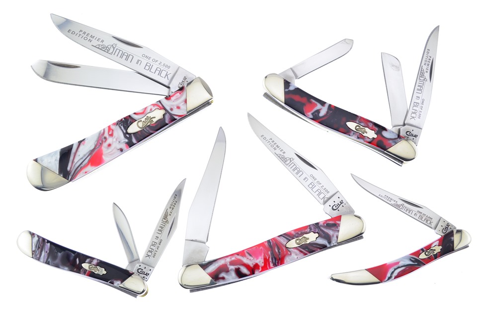 This set by Case is a great addition to your collection! Included in this set is one of the 3" Man In Black Corelon® Small Toothpicks, featuring Etched Blade, one of the 3 7/8" Man In Black Corelon® Muskrats, one of the 2 7/8" Man In Black Corelon® Peanuts, featuring Slanted Bolsters, one of the 4 1/8" Man In Black Corelon® Trappers with Slanted Bolsters, and so much more! You won't find a lower price anywhere!