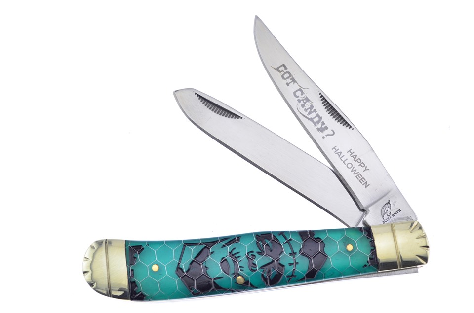 Got Candy? The 4 1/4" Honeycomb Glow Resin "FRANK" Trapper by Ocoee River Cutlery is a long-time best-seller! With Thumbnail Pull and Decorative Bolsters, no one can resist, so get yours while you can! #happy Halloween
