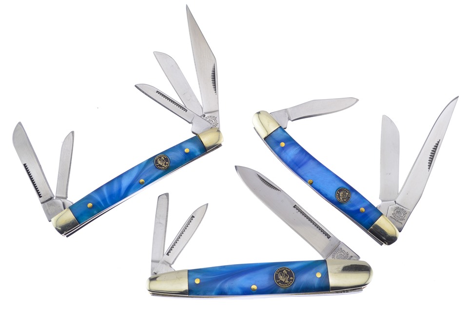 Here's a value you really don't want to miss. You'll receive one of the 3 1/2" Blue Bayou Resin Kentucky 5-Blades, one of the 3 1/2" Blue Bayou Resin Stockmans, and one of the 4" Blue Bayou Resin Whittlers, featuring Nickel Silver Bolsters. Not all of these components will stay in stock, so throw this in your shopping cart now!