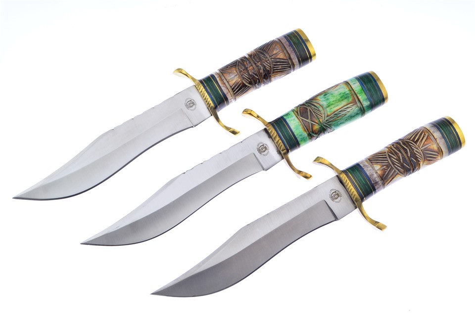 This set is a great addition to any collection. You'll receive one of the 12" Brown Bone Bowies, one of the 12" Green Bone Bowies, and one of the 12" Brown Bone Bowies with Brass Guard. Sets like these go fast, so get yours while you can!
