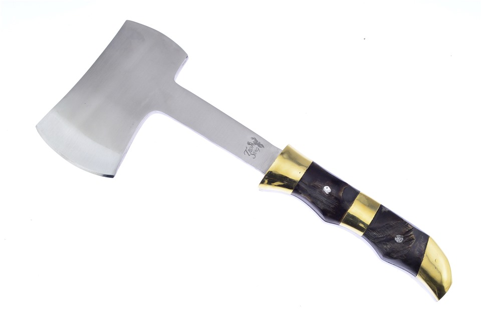 Trophy Stag fans are going to love this 12" Ram's Horn Hatchet! With Full Tang Construction, Stainless Steel Blade, and Brass Spacers, stock is limited, so add to your cart before they are all gone.