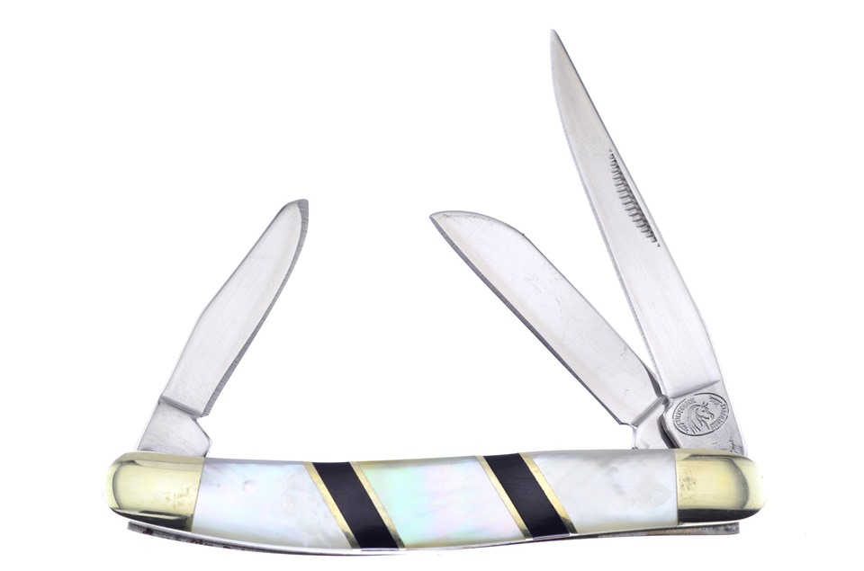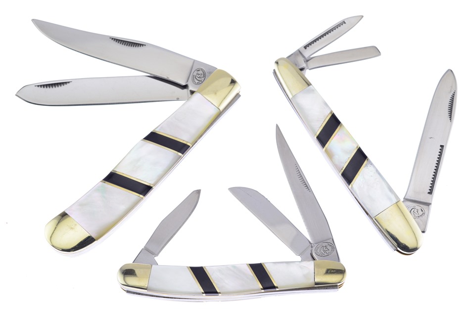 Here's a value you really don't want to miss. You'll get one of the 3 1/2" Mother of Pearl/Black Onyx Combination Stockmans, one of the 4" Mother of Pearl/Black Onyx Combination Whittlers with Decorative Inlays, and one of the 4 1/8" Mother of Pearl/Black Onyx Combination Mustang Trappers, featuring Decorative Inlays. Sets like these go fast, so get yours while you can!