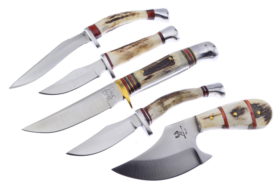 Just the thing for knife collectors everywhere. You'll receive one of the 6 1/2" Stag Bowies, one of the 8" Stag Hunters, one of the 7 1/2" Stag Skinners, featuring Stainless Steel Blade, one of the 6 1/2" Stag Skinners with Stainless Steel Pommel, and one of the 6" Stacked Stag Skinners with Wood Spacers. Not all of these components will stay in stock, so throw this in your shopping cart now!