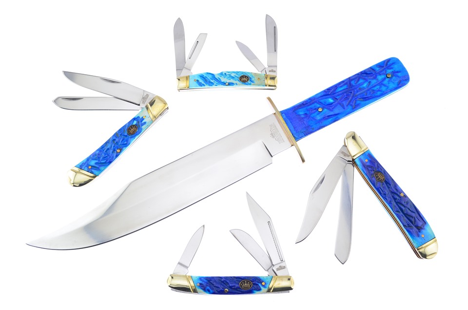 This set by Joseph Rodgers & Sons is a great addition to your collection! You'll receive one of the 4 1/4" Pacific Blue Bone Trappers, one of the 4" Pacific Blue Bone Wranglers, featuring Stainless Steel Blade, one of the 3 1/2" Pacific Blue Bone Congresss, one of the 4 3/4" Pacific Blue Bone Dogleg Trappers, featuring Stainless Steel Blade, and one of the 14" Pacific Blue Bone Bowies with Etched Blade. Sets like these go fast, so get yours while you can!