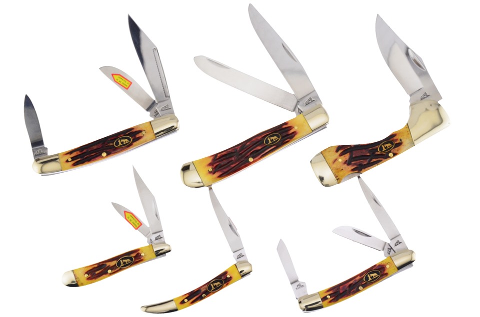 Here's a set of knives no collector will want to miss. You'll get one of the 3 3/4" Winter Aged Bone Choctaws, one of the 2 7/8" Winter Aged Bone Peanuts, one of the 4 1/4" Winter Aged Bone Trappers, featuring Custom Shield, one of the 3" Winter Aged Bone Toothpicks, one of the 4" Winter Aged Bone Wranglers, and one of the 3 1/4" Winter Aged Bone Range Riders, featuring Nickel Silver Bolsters. You won't find a lower price anywhere!