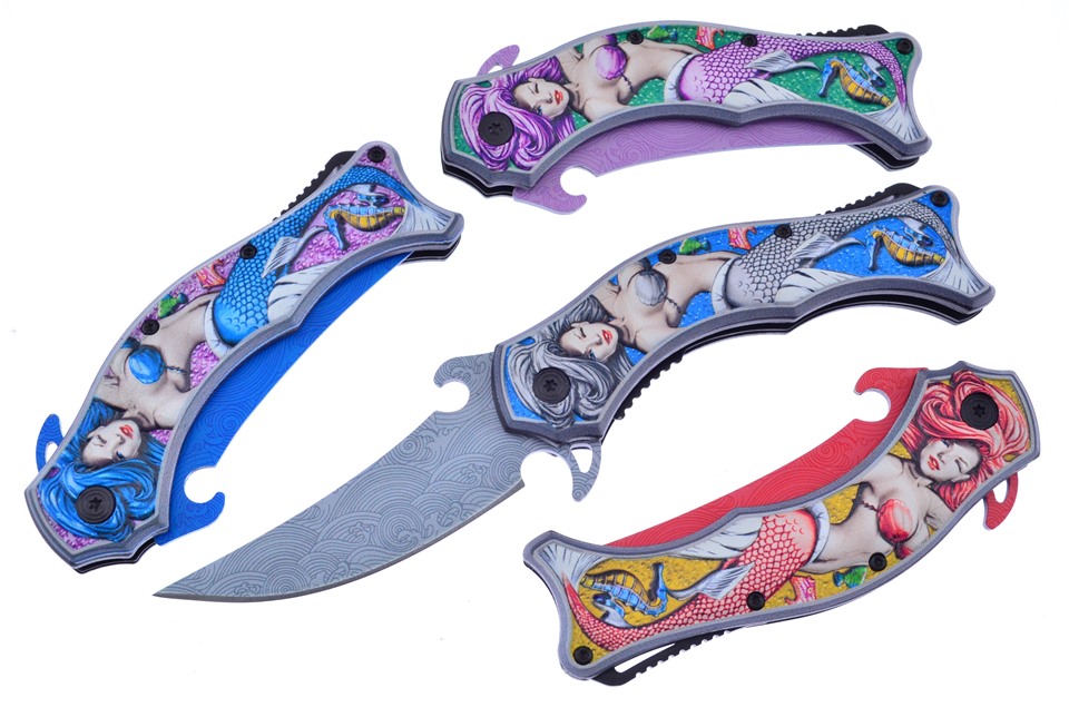 Here is a set of Elite knives you don't want to miss! You'll get one of the 4 1/2" Printed Blue Aluminum Snapshot Tacticals, one of the 4 1/2" Printed Grey Aluminum Snapshot Tacticals, one of the 4 1/2" Printed Purple Aluminum Snapshot Tacticals, and one of the 4 1/2" Printed Pink Aluminum Snapshot Tacticals, featuring Titanium Coated Blade. You won't find a lower price anywhere!