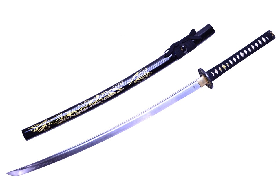 This gorgeous Heart of a Warrior Katana is designed by Lee Chin. It features 1060 High Carbon Steel that has been tempered using a high temperature clay treatment. The sword is 40.5" overall. The handlle is 11". The blade is 28" with a 55 HRC hardness.