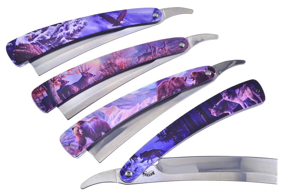 Just the thing for wildlife collectors everywhere! With this set you'll recieve four razors measuring 5.5" closed in an assortment of wildlife prints. The ABS handle designs include Deer, Eagle, Wolf, and Bear print.