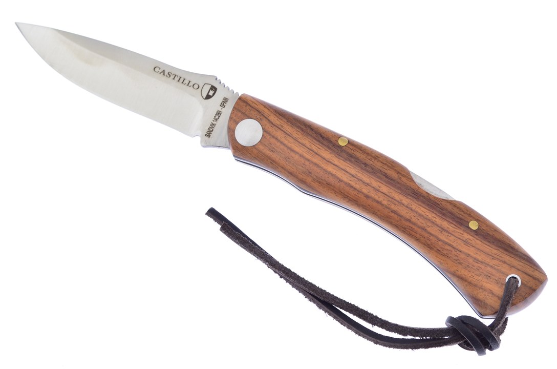 This premium Torre style knife by Castillo Brand is not something you're going to come across every day! It measures 3 3/4" closed and has an organic Bocote Wood handle material. Other features include a stainless steel blade, lockback mechanism, and lanyard. With your knife you will receive a leather pouch style sheath for safe keeping, a ceramic sharpening stone, and a Ballistol single use wipe for cleaning. The Torre is made in Spain. Its' accessories are Made in the USA. Stock is limited. Add this to your cart before it sells out!