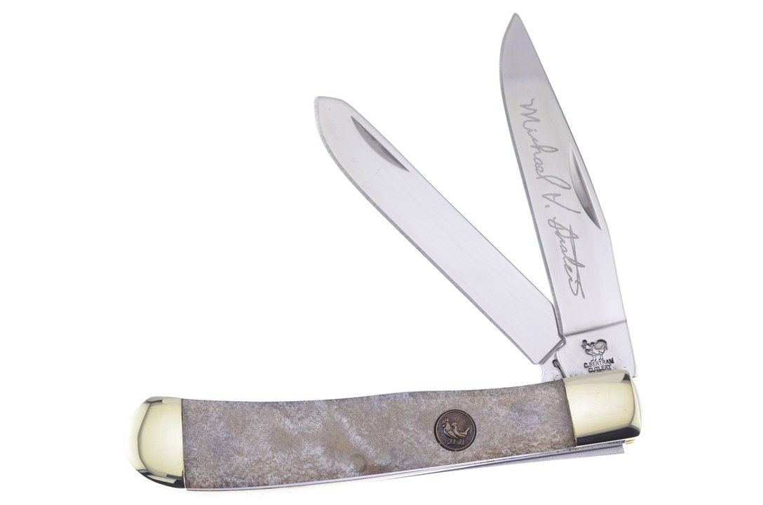 Here is a brand new Trapper by Michael Prater that no collector will want to miss! The knife measures 4 1/4" closed and has German stainless steel blades with laser etching, nickel silver bolsters, and a new handle material known as Desert sand. As always, we will include a Certificate of Authenticity with your custom knife purchase!