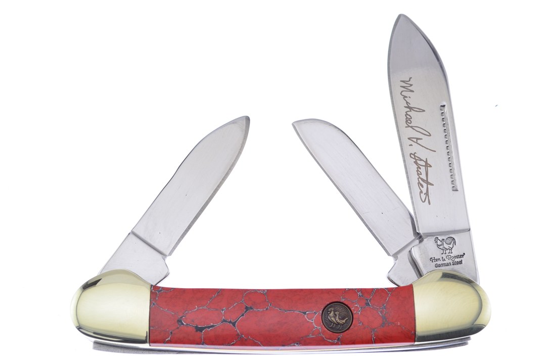 Here is another great piece by Michael Prater of Painted Pony Customs! This Gunboat Canoe measures 4 1/4" closed. It has German Stainless steel blades, a signature etch, nickel silver bolsters, and a custom Red Dino bone handle material. As always, we will include a certificate of authenticity with your custom purchase!