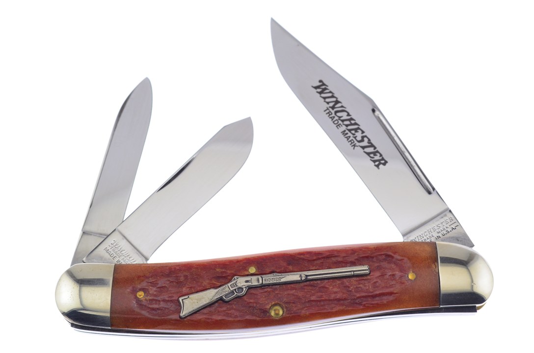 Here is another great Stockman by Winchester brand! This piece measures 4 1/2" closed. It has brass pins, nickel silver bolsters, and a custom rifle shield! Get yours while supplies last!