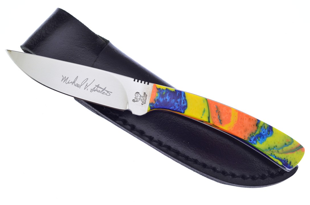 Here is a custom Prater piece you won't want to miss! This Hen & Rooster skinner measures 7 1/4" overall and has German still throughout with full tang construction. The blade has a signature etch and the handle has been customized with the signature feather macaw material. We are including a certificate of authenticity with every custom purchase! Get yours before it sells out!