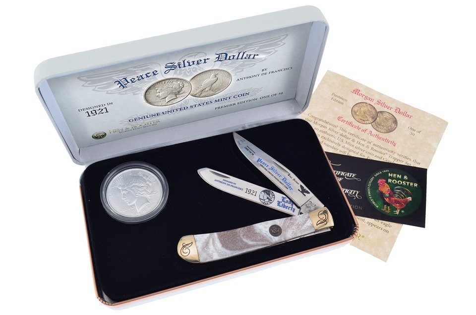 Introducing the Peace Silver Dollar coin and Trapper set by Michael Prater! This set includes a customized Hen & Rooster trapper, a Collector's box, and a Certificate of authenticity. Get yours before it sells out!