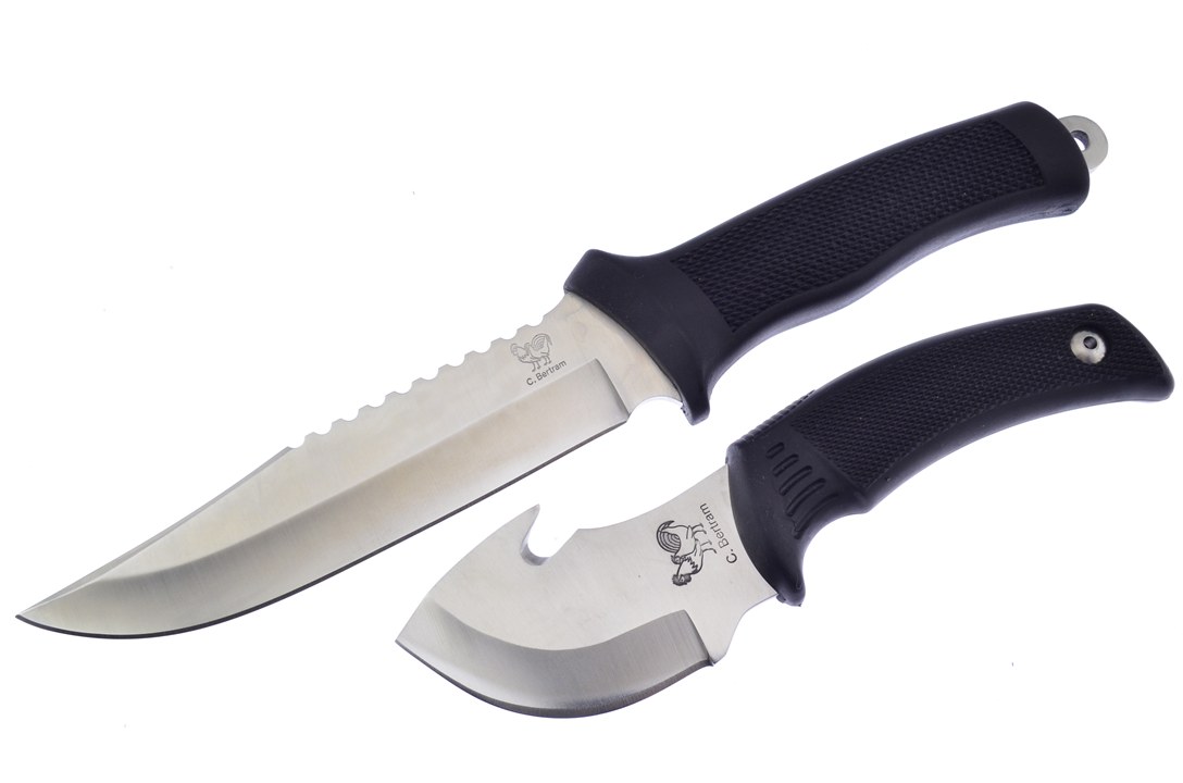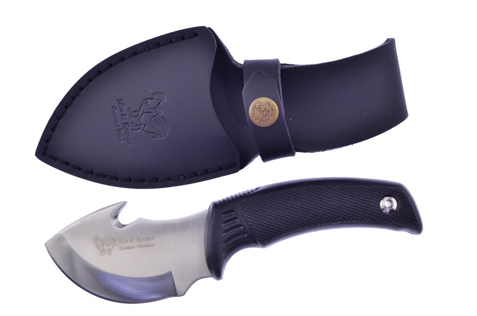 The non-slip special by Hen & Rooster brand includes a 11" overall bowie and 7.5" overall guthook skinner. Both have sure-grip handles, german stainless steel, and leather sheaths. Get your set before they sell out!