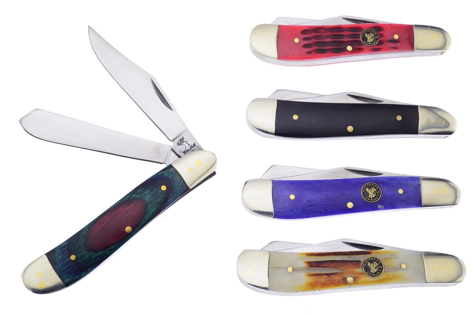 Check out this gorgeous Trapper collection by Whitetail Cutlery! Each measurs 3 1/2" closed. Handle materials in this set include buffalo horn, dark red jigged bone, frost wood, purple smooth bone, and second cut bone. Get your set before they sell out!
