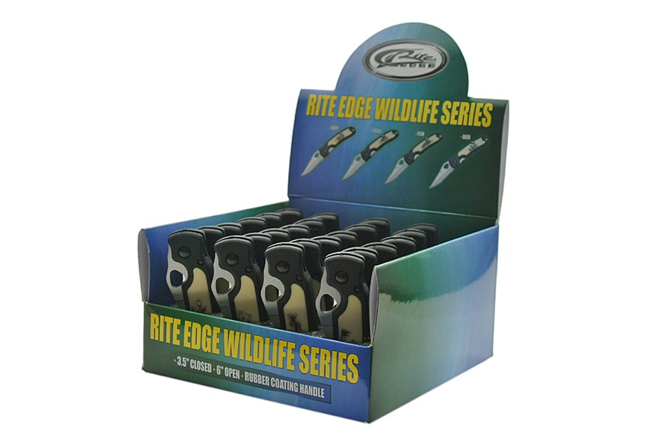 Point-of-purchase displays are a great way to make an additional sale while customers are checking out. Efficiently use your space to offer attractive product with this perfectly packaged 24 piece wildlife collection by Rite Edge! Handle designs includes four different wildlife prints! At this price point you can easily double your money with minimal space and effort!