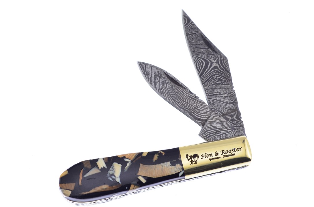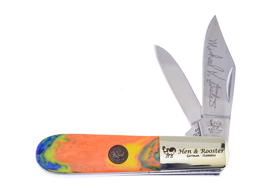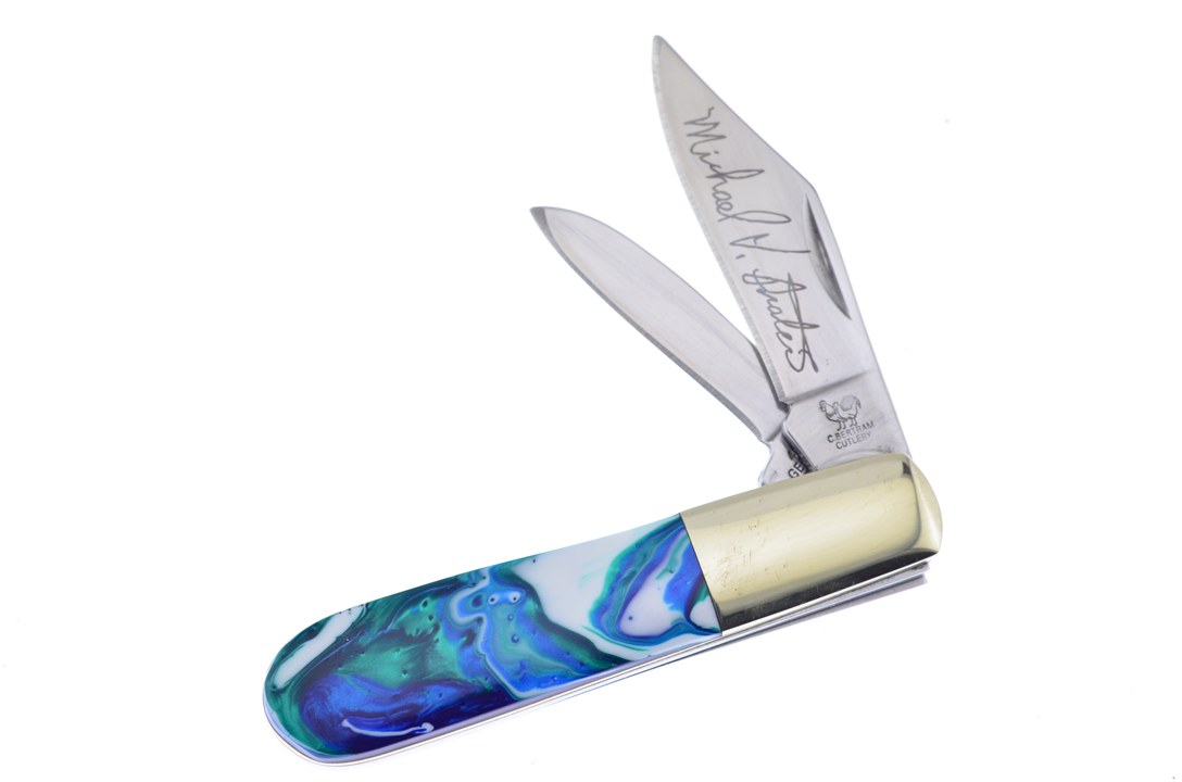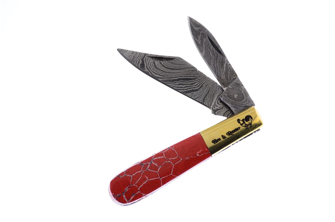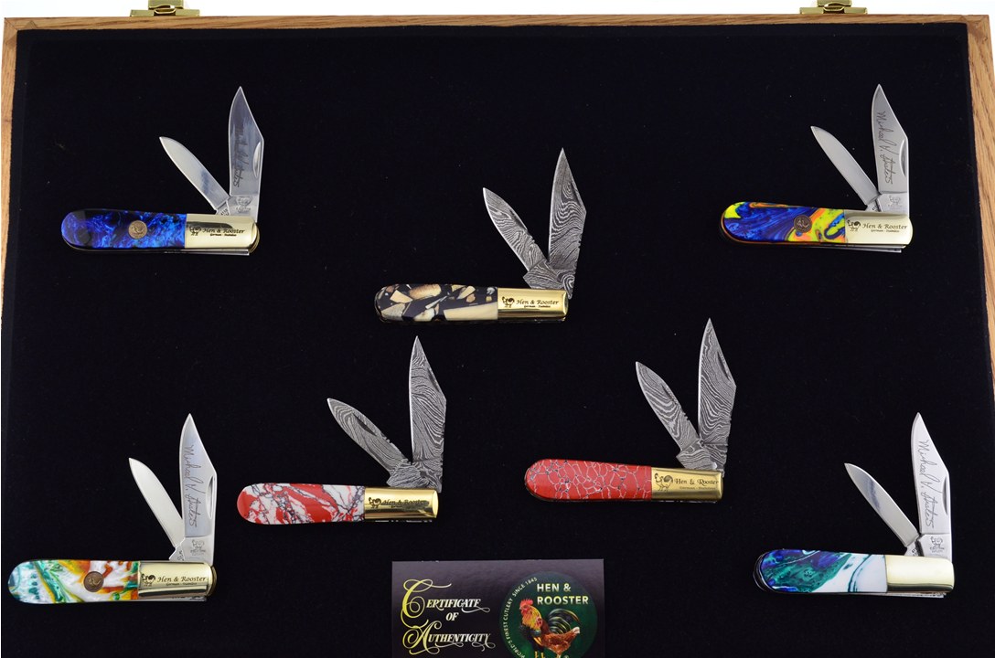 You don't want to miss out on this Barlow collection by Michael Prater! Each measures 3 1/4" closed and includes the following handle materials: Mammoth chunk, Blue Velvet, Emerald River, Feather Macaw, Northern Lights, Pony Jasper, and Red Dino Bone. These come in a customized 12x18 wood display case. Get yours while supplies last!