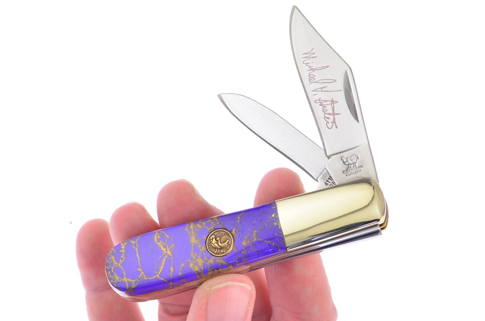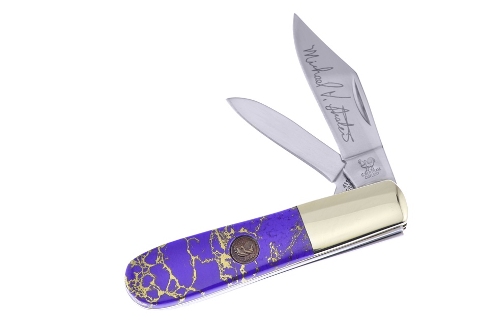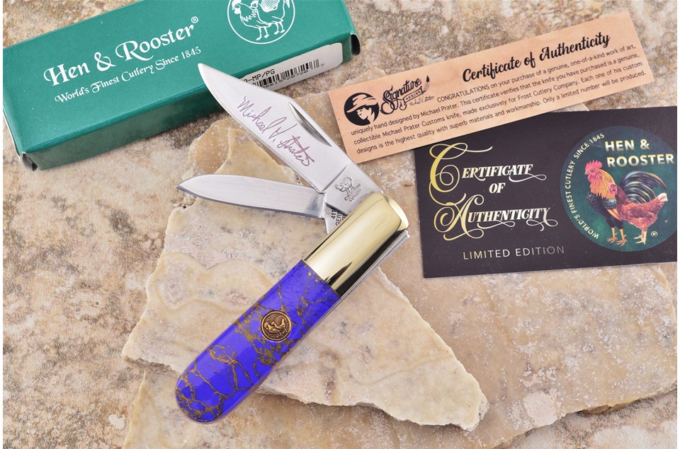 Here's a Michael Prater knife that no collector will want to miss! This Barlow measures 3 1/4" closed and has a custom Sugilite Matrix handle material. As always, we will include a Certificate of Authenticity with your custom purchase!