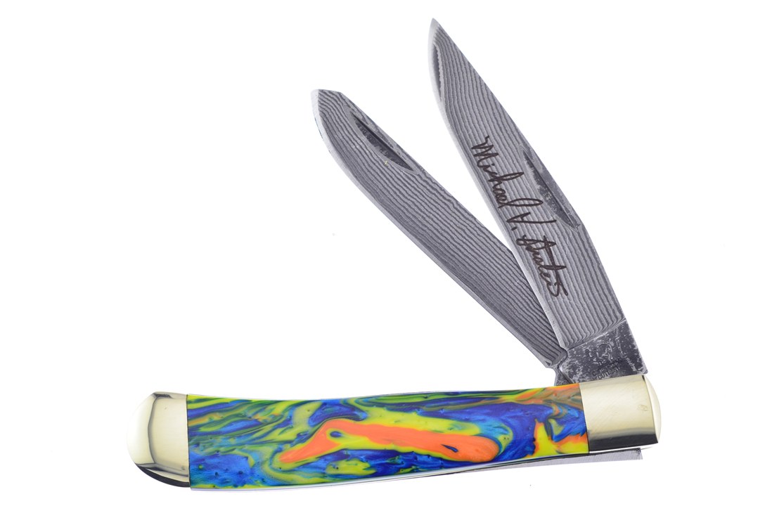 Introducing the Michael Prater Feather Macaw Damascus Trapper! This piece measures 4 1/4" closed and flaunts a flawless custom handle material. As always, we will include a certificate of authenticity with your custom purchase!
