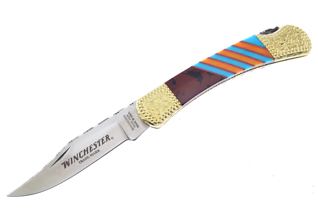 Introducing the Painted Pony North Territory Lockback! This piece is going to be flying off the shelves. On the handle you will see Obsidian Stone with Sleeping Beauty Turquoise and Orange Stone Inlays. Don't miss your chance to get one!