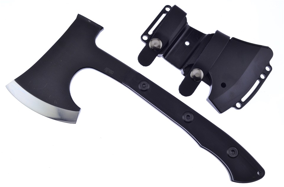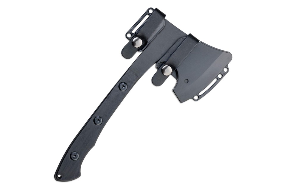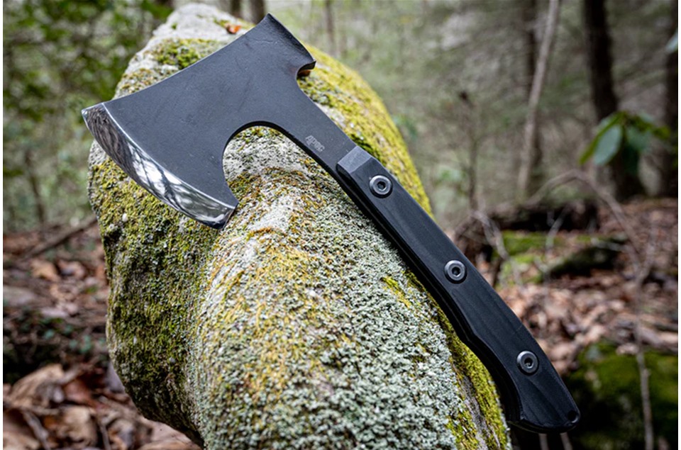 The Viking-style bearded head lets you choke up to easily make feather sticks, prep some kindling or carve notches for traps. The whole hatchet is milled from a single piece of 9260 spring steel that's tempered to the low 50's HRC. Handle scales are solid milled G10, contoured for comfort with a swell at the end to keep it in your hand.