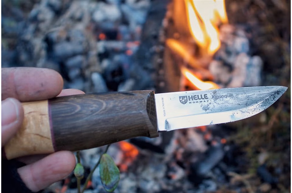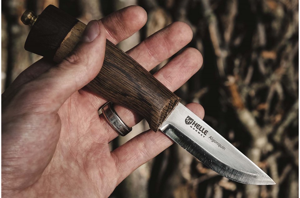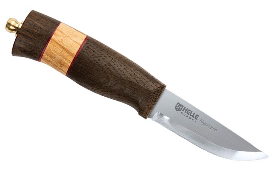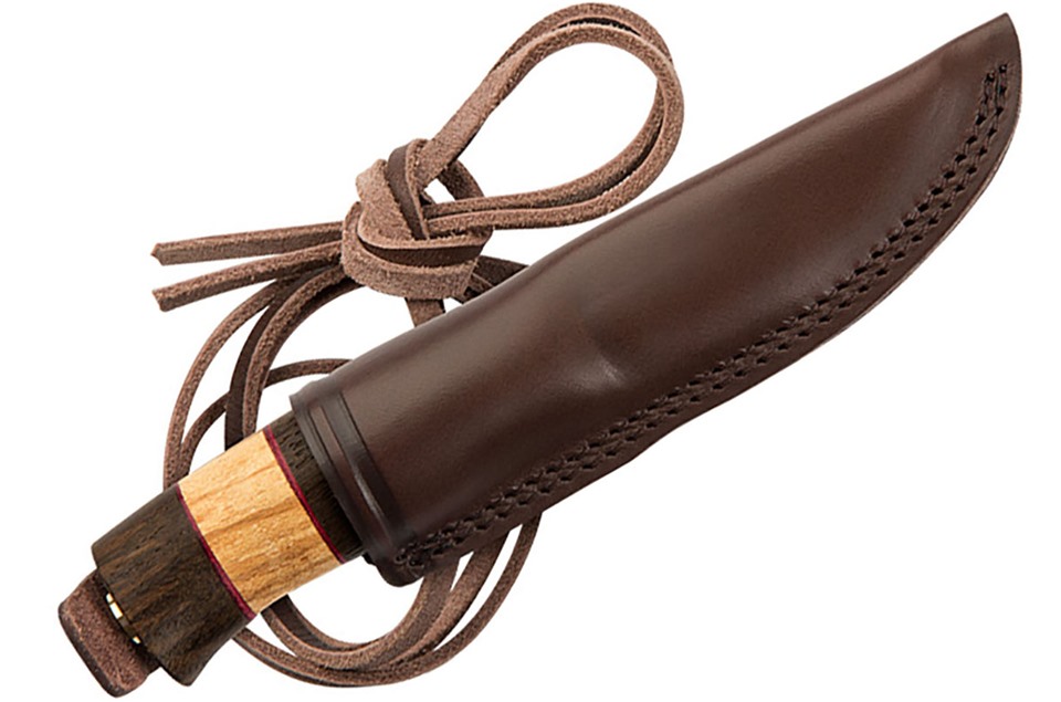 Handmade in Norway using darkened oak, curly birch and red leather inserts, the handle shape features a slight pommel at the end, as well as a small finger guard and thumb notch for maximum dexterity and superior handling. The 69 mm blade is made with Helle's triple laminated stainless steel for unparalleled strength, sharpness and corrosion protection.