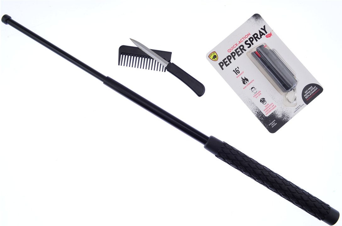 This Self-Defense set includes a 26" baton, Pepper spray, and a comb style letter opener. Restrictions may apply depending on your state. Get your set while supplies last!