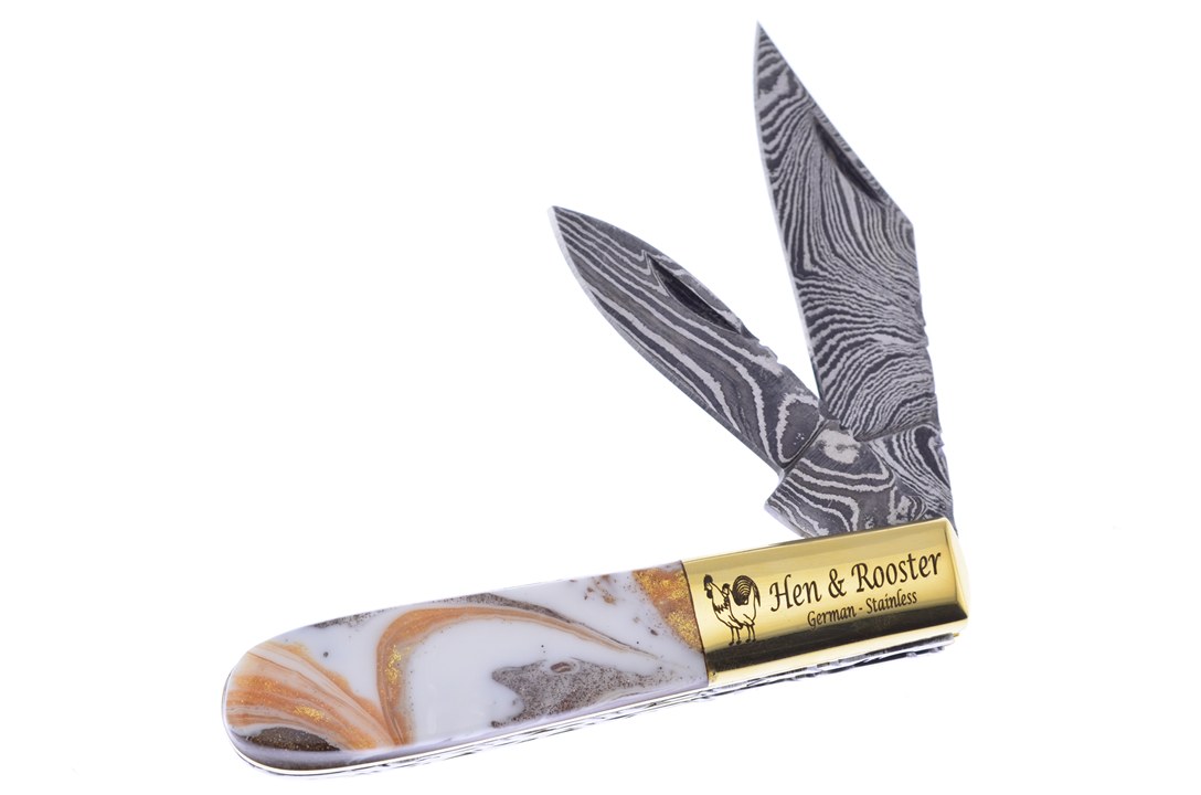Introducing the Avalanche Barlow by Hen and Rooster! This piece measures 3 1/4" closed and flaunts Damascus steel. Get yours while supplies last!