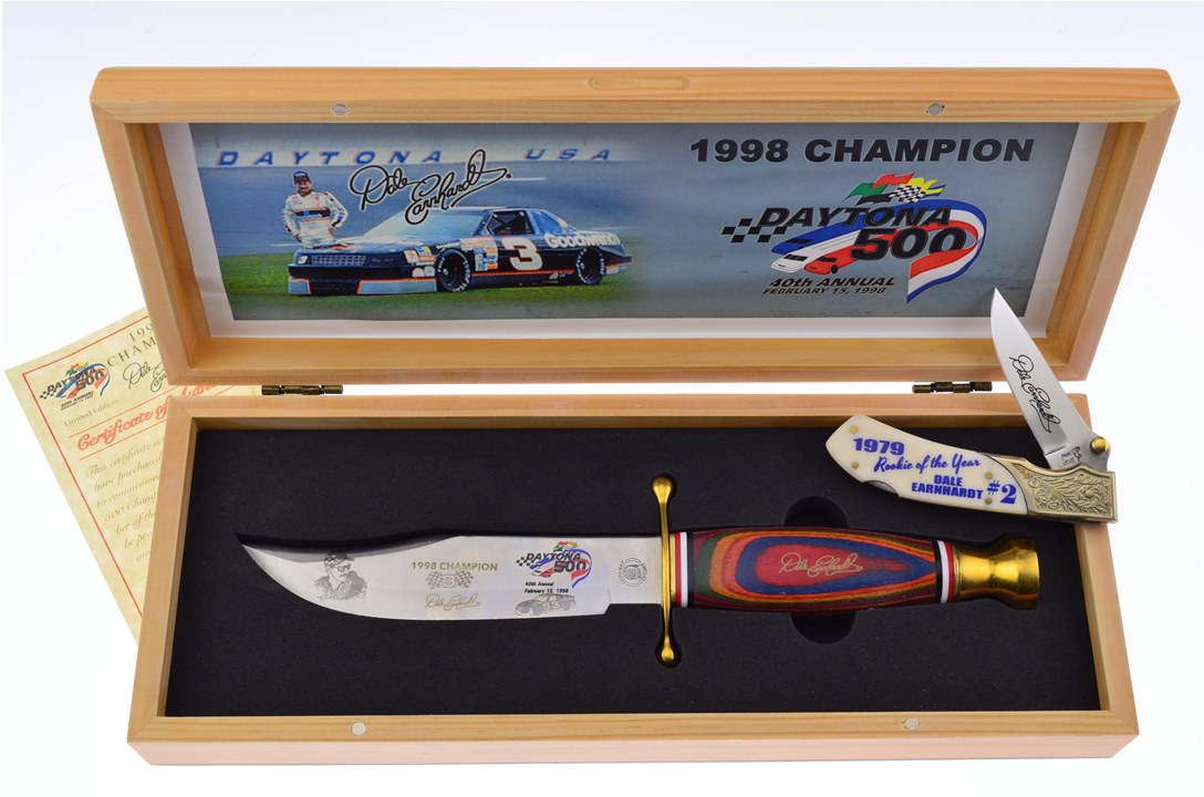 This Tribute to Dale Earnhardt set includes a customized 11 1/2" overall Daytona 500 Chipaway Bowie along with a 4 1/4" closed Rookie of the Year Tactical Folder. Get your set while you stilll can!
