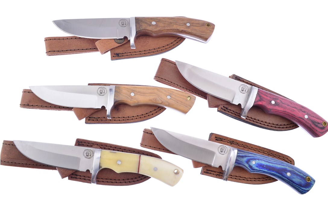 Just the thing for knife collectors everywhere. You'll get one of the 8 3/4" Blue Pakkawood Hunters, one of the 8 3/4" Olive Wood Hunters, one of the 8 3/4" Red Wood Hunters, one of the 8 3/4" White Smooth Bone Hunters, featuring Stainless Steel Pins, one of the 8 3/4" Walnut Wood Hunters with Drop Point Blade. You won't find a lower price anywhere!