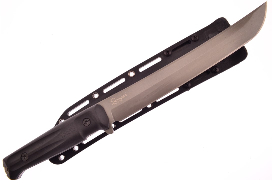 The Sensei Tactical Tanto in D2 Tool Steel The Sensei knife connects the beauty of the Oriental traditions with Russian practicality. Functionally it combines a camp knife, a machete and a Japanese Tanto (long knife). The Tanto ground blade is 8 5/8" in length with a thickness of 4.6 mm, it just begs to be put to work. When in hand it feels like a small sword and radiates reliability and power. The weight balance is shifted slightly towards the blade, which allows slicing, cutting and hacking with comfort. Full-tang design guarantees strength. Special heat-treatment is done to give the blade reliability and durability at any workloads. Non-slippery soft Kraton handle (with hard ABS underneath) with removable scales and full-sized guard guarantee comfortable and secure grip. The light PA sheath features a rotatable clip on a highly versatile rotatable (SP) platform that can be installed in a number of ways on different areas of the long sheath to make sure the user gets the most comfortable carry option. The s